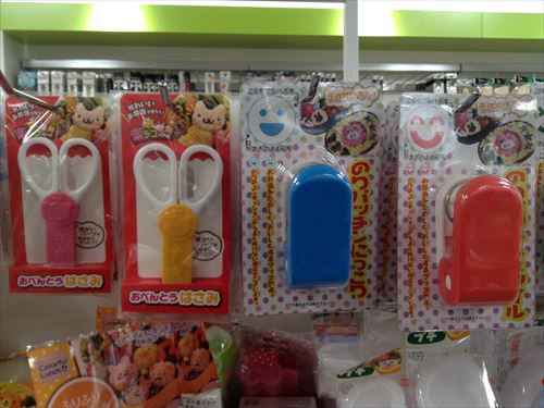 細かいデコ弁に使えるお弁当用はさみ。右は海苔を顔の形に切れるのりパッチン。