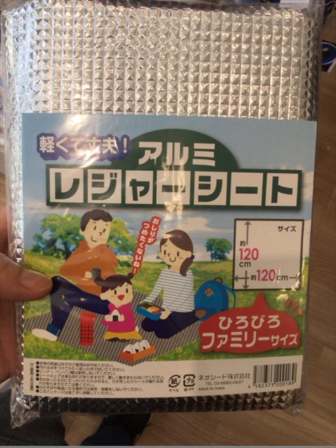 レジャーシートですが、水に濡れてもOKなアルミタイプです。ファミリーサイズ(120cm×120cm)。軽くて丈夫。