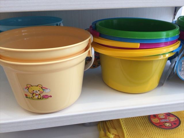 大きな子供用バケツもあります。下はお砂場セットを片付ける入れ物。