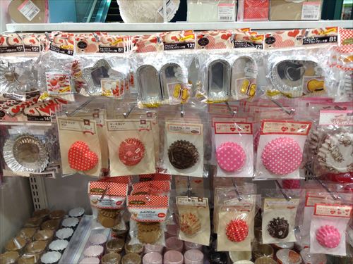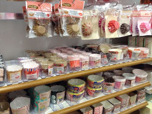 紙で出来たマフィンやマドレーヌのカップがたくさんあります。この列はカップケーキだけで一杯でした。