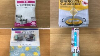 100均「ダイソー(Daiso)」のおすすめキッチン用品、まとめ。①水切りネット ストッキングタイプ、②揚げ物の油飛び防止「ガスレンジガード」、③油吸収パット 、④水筒洗い「コップボトル洗い・2段階伸縮タイプ」など。
